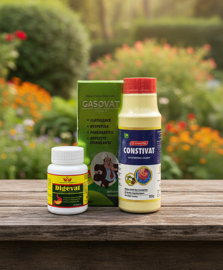 Constivat & GasoVat Digestive Care Combo is a specially formulated Ayurvedic combination designed to support healthy digestion and help manage common gastric discomforts. This combo contains carefully selected herbal formulations traditionally used in Ayurveda to support digestive health, improve appetite, and help reduce issues such as flatulence and indigestion.