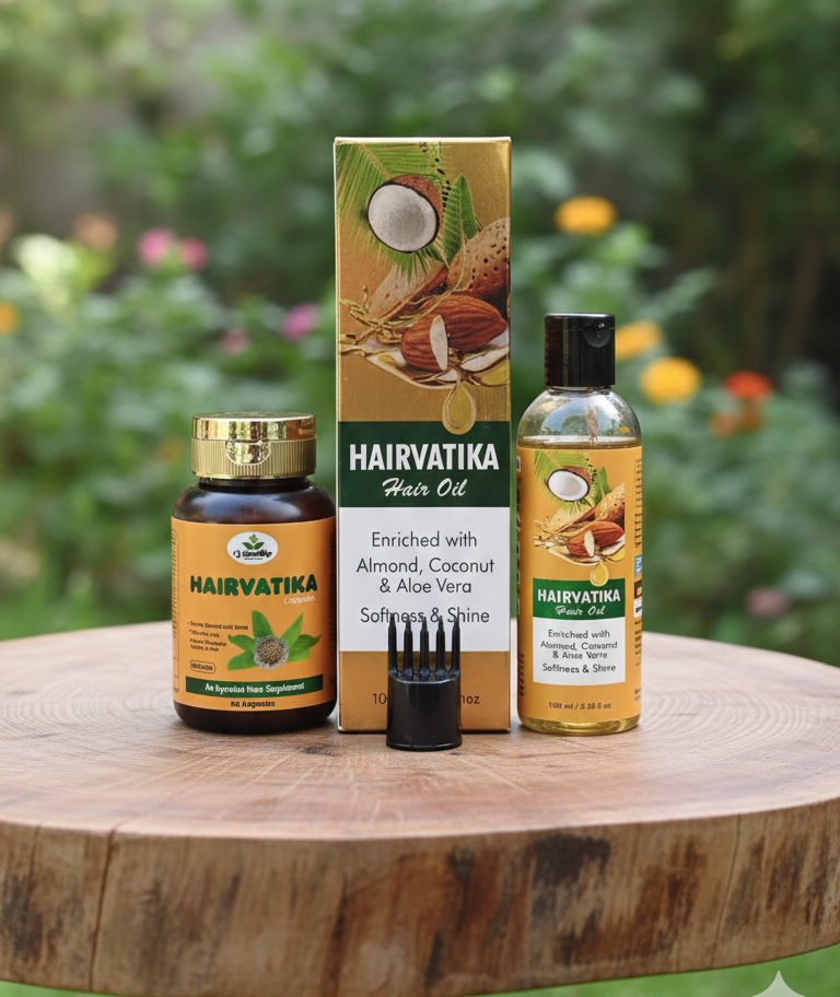 Hairvatika Hair Growth Combo is a specially formulated Ayurvedic combination designed to support healthy hair growth and scalp nourishment. This combo includes Hairvatika Hair Oil along with herbal capsules made with traditional Ayurvedic ingredients known for promoting stronger, healthier hair.