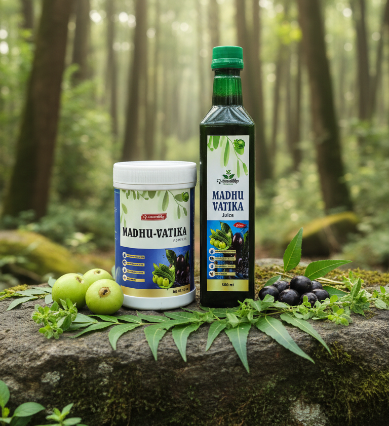 Madhu Vatika Diabetes Combo is a specially formulated Ayurvedic herbal blend created to help support individuals looking to maintain balanced blood sugar levels naturally. The combo includes Madhu Vatika Powder and Madhu Vatika Juice prepared with traditional herbs used in Ayurveda for overall wellness and metabolic support.