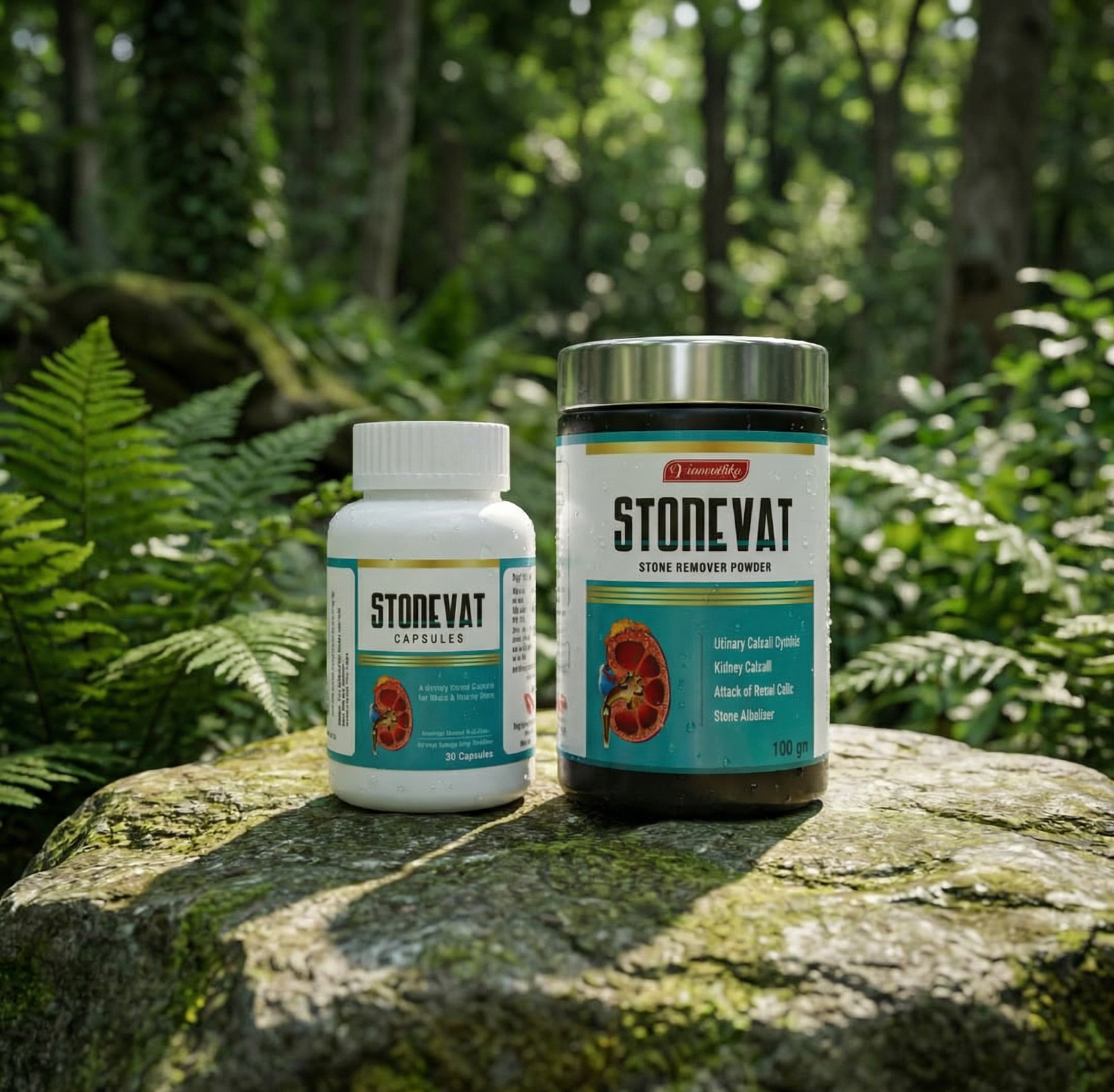 Stonevat Kidney Stone Care Combo is an Ayurvedic herbal formulation designed to support kidney health and help manage kidney stone discomfort. The combo includes Stonevat Capsules and Stonevat Powder formulated with traditional Ayurvedic ingredients known to support urinary health and kidney wellness.